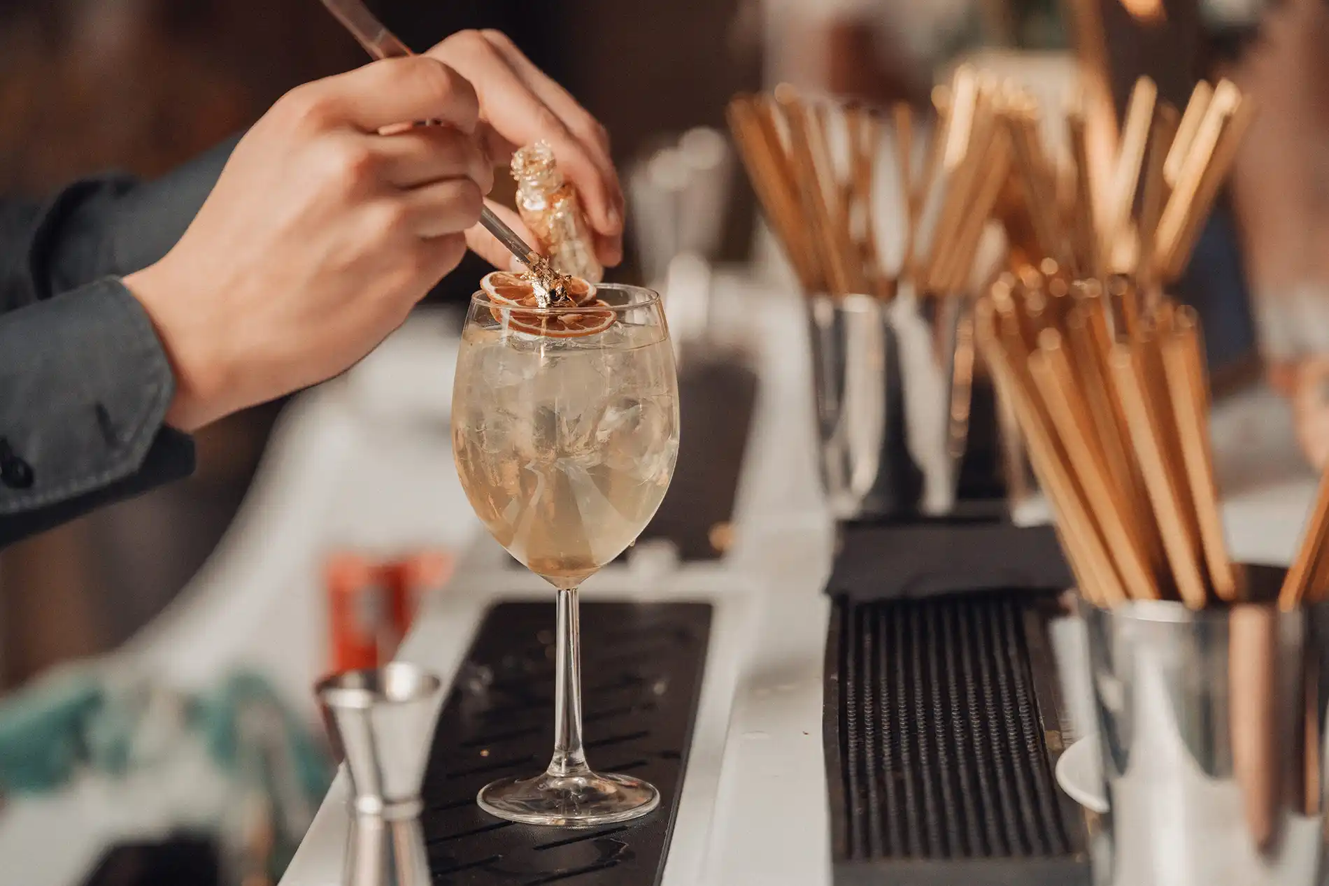 Nous avons pensé à chaque détail pour personnaliser l’événement au mieux, un mixologiste était sur place en vue de la préparation des cocktails, notamment le cocktail signature, le « Clara’s Golden Spritz ».